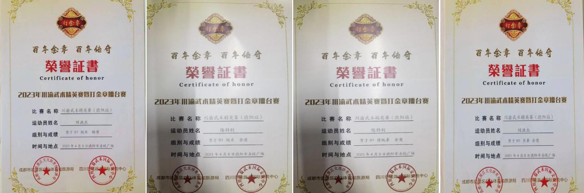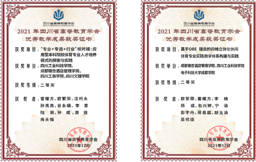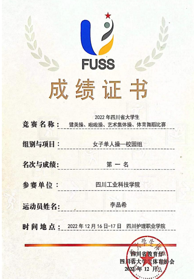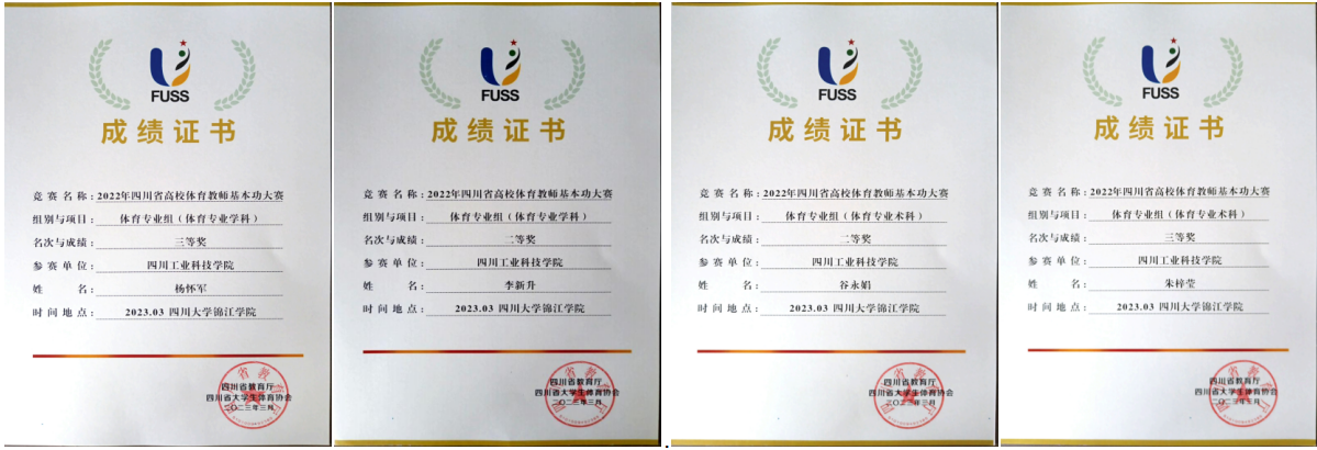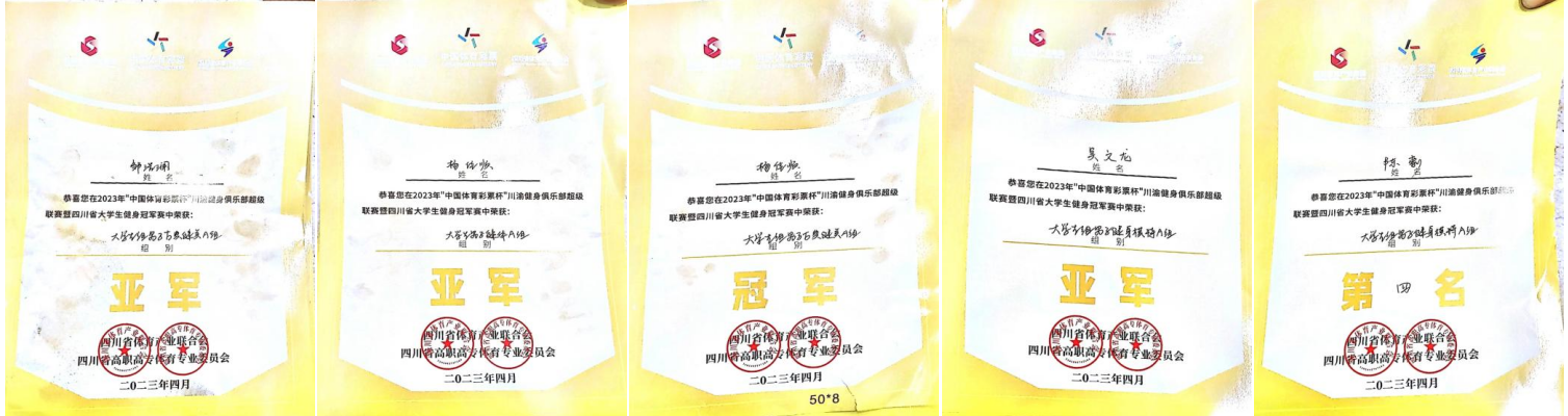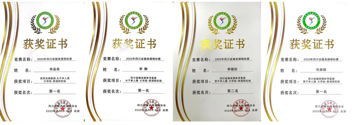2020-2023年健身健美类项目比赛获得全国一等奖1项、二等奖5项、三等奖11项;四川省健美操锦标赛等比赛获得省级一等奖18项、二等奖22项、三等奖53项。