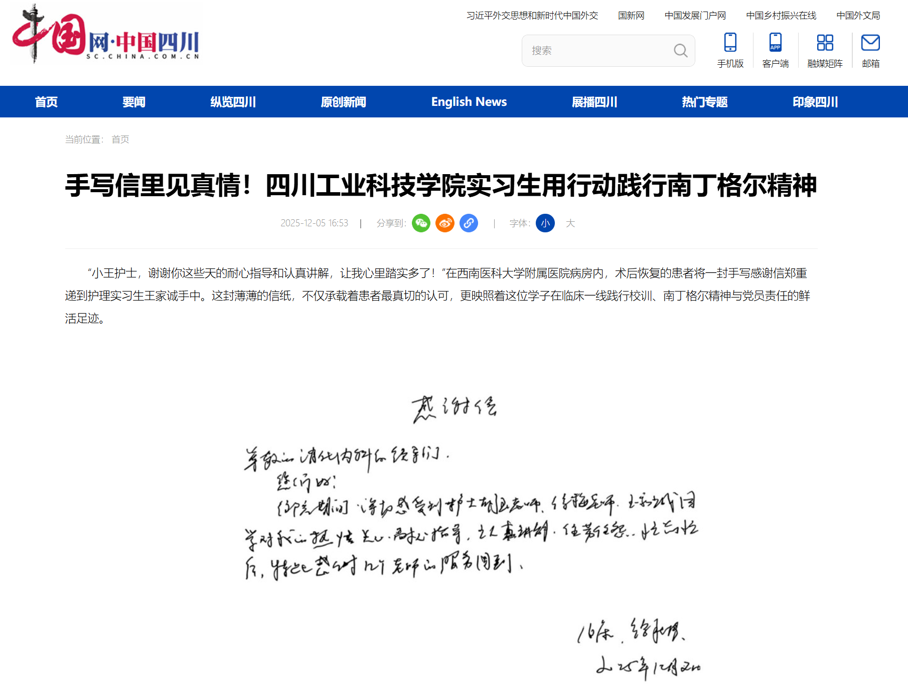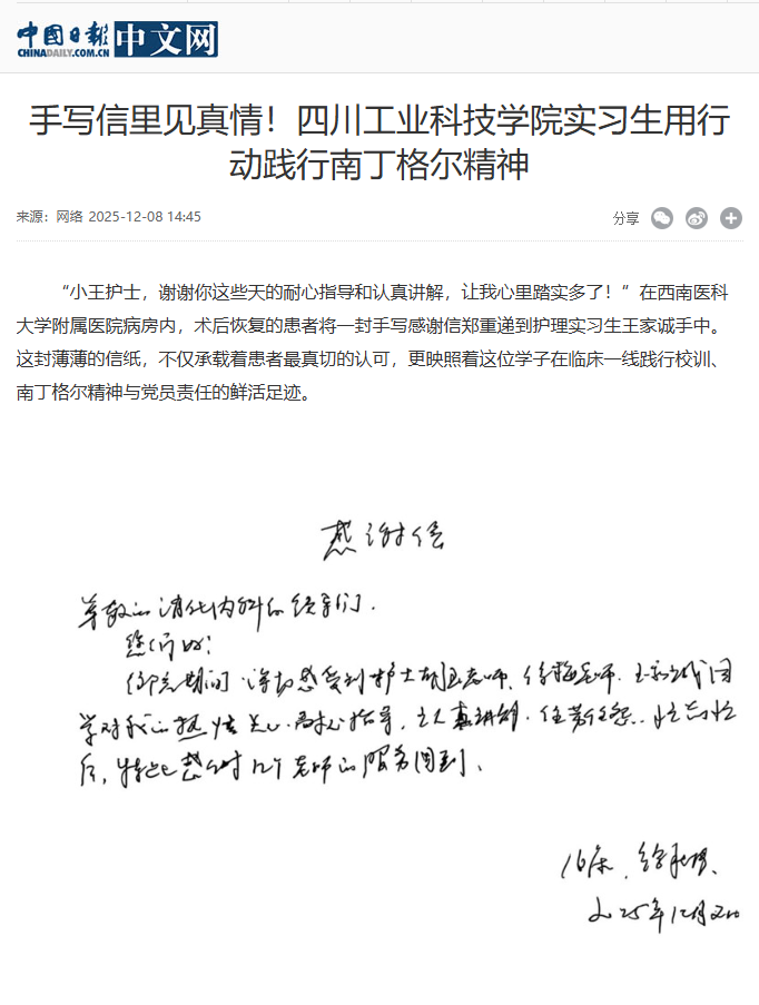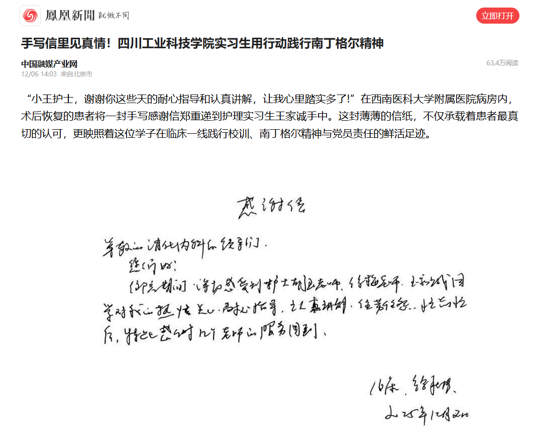 学院2022级护理学专业学生王家诚,在西南医科大学附属医院实习期间,始终践行学院“仁德、博爱、业精、奉献”的院训精神,以认真负责的工作态度和扎实过硬的专业素养,赢得了带教老师、患者及家属的广泛认可与好评,多次收到患者的感谢信,并被“中国日报网”“中国网”“凤凰新闻”“德阳日报”等多家媒体报道!