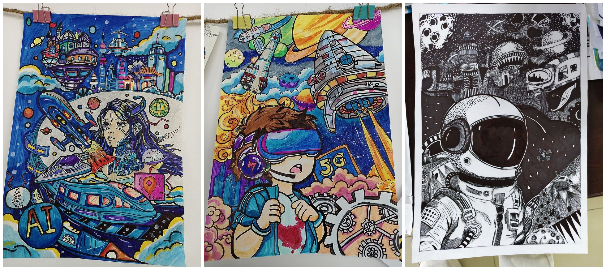 面对人工智能等科技的飞速发展,社区举办了“以画笔为钥,叩响未来之门”科技主题绘画活动,鼓励学生描绘心中的未来科技图景。同学们提交的作品视角多元、构思新颖,内容涵盖智慧城市、星际探索、人机共生等多个前沿领域,生动表达了年轻一代对科技发展的期待、思考与责任意识。活动成功搭建了激发想象力、探讨科技伦理、展望未来的交流平台。