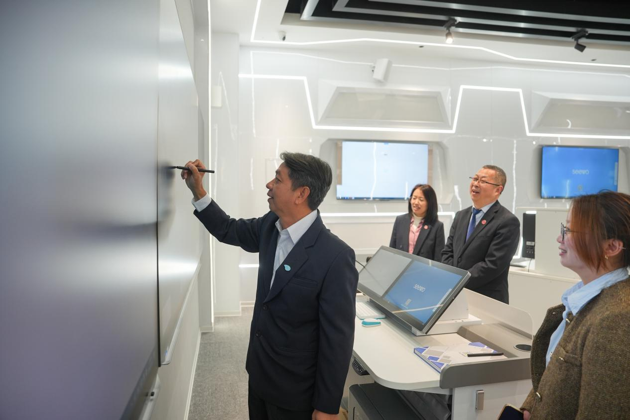 访问期间,Phoom Srisook一行在黄斯欣陪同下,参观了学校同心广场、大师工作室、龑江运动中心、智慧党建馆、龑江新图书馆及第四代智慧教室等场所,深入了解学校人文氛围与办学活力。泰方嘉宾对学校在智慧校园建设与前沿技术运用方面取得的成效给予高度评价。