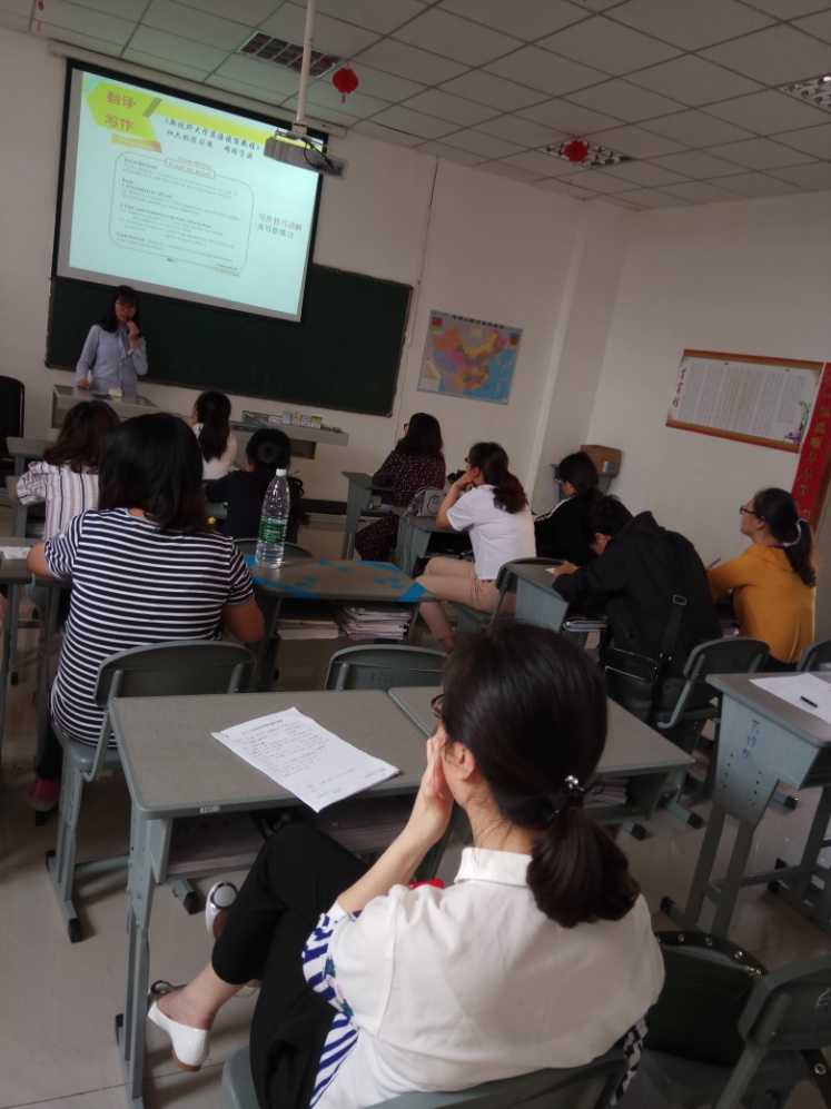 教师肖超和孙露洁严格按照教务处的说课要求,从课程性质、课程资源、课程内容、课程实施、课程改革和课程评价六个方面,分别就商务英语专业的《英语语法》和通识课程《大学英语四》进行了15分钟时长的说课。两位教师的教育理念也尽情彰显,其中肖老师提到要改善英语语法教学需要跨学科借鉴,例如,认知心理学、认知语言学和认知诗学等。而孙老师则结合国家的“一带一路”政策和中国提高的国际地位等实情,提出了自己的英语教学改革思路。其他教师认真聆听、仔细记录,并对两位教师的说课进行了热烈的讨论。