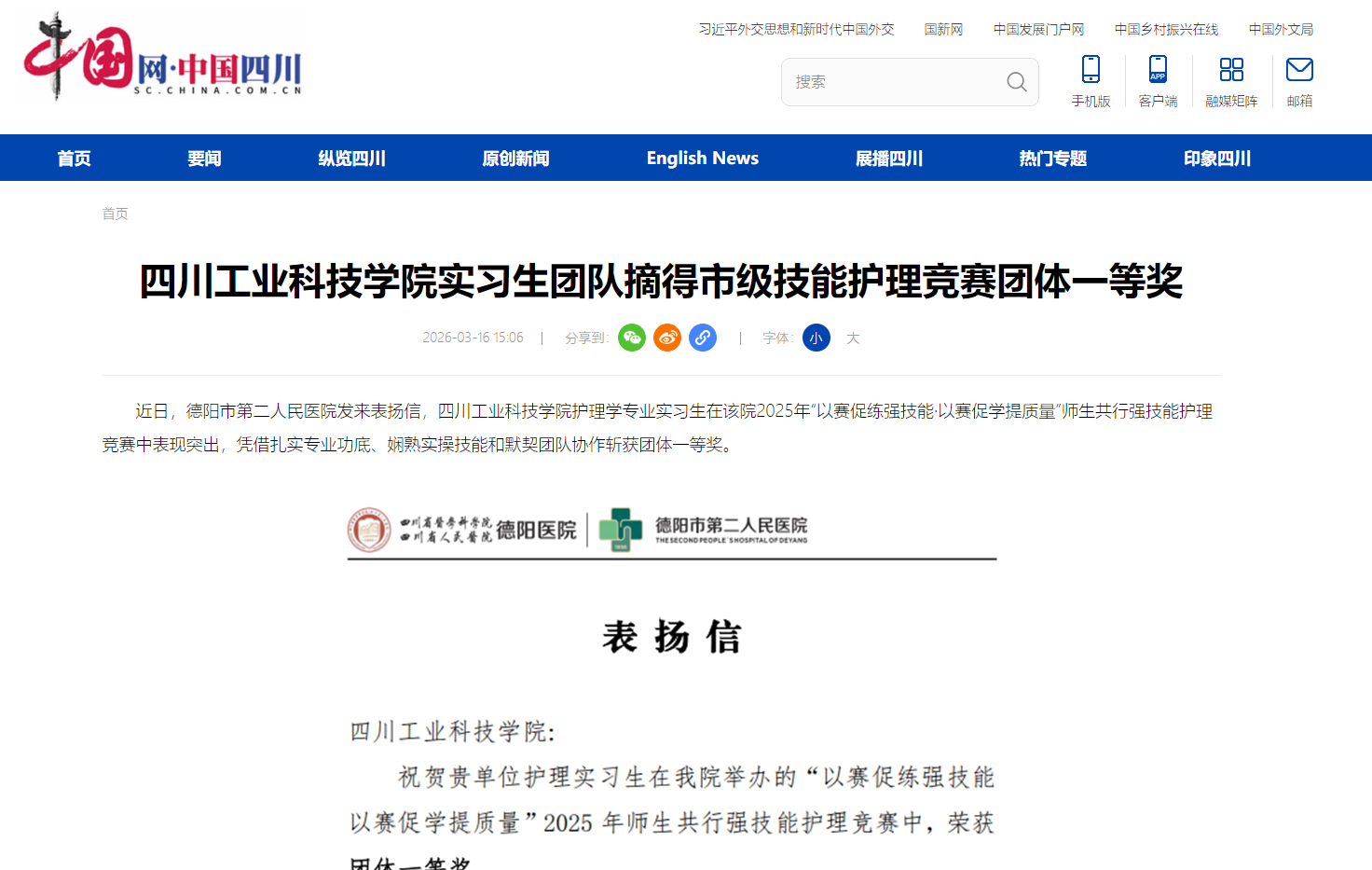 近日,德阳市第二人民医院发来表扬信,四川工业科技学院护理学专业实习生在该院2025年“以赛促练强技能·以赛促学提质量”师生共行强技能护理竞赛中表现突出,凭借扎实专业功底、娴熟实操技能和默契团队协作斩获团体一等奖。