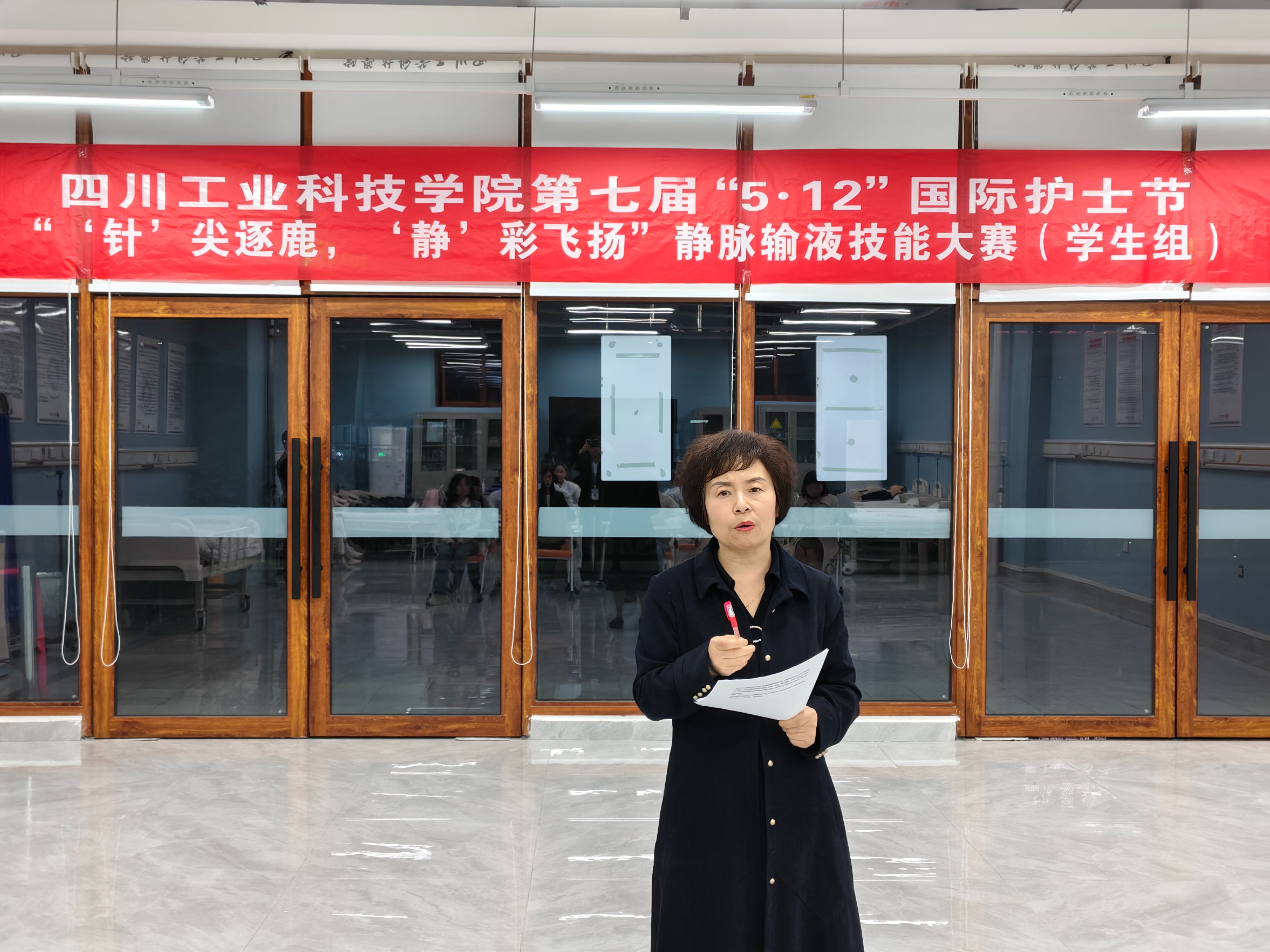 银针护佑生命,匠心点亮微光。为进一步提升护理专业学生的临床实践能力,强化人文关怀意识,4月21日晚,大健康学院在龑江医学护理实验实习中心207室举办静脉输液技能大赛。学院副院长刘琼碧、教学办副主任蒋梦碟及专业教师杨正双、胡桂萍、杨娅坤担任评委,徐宇同学担任主持。