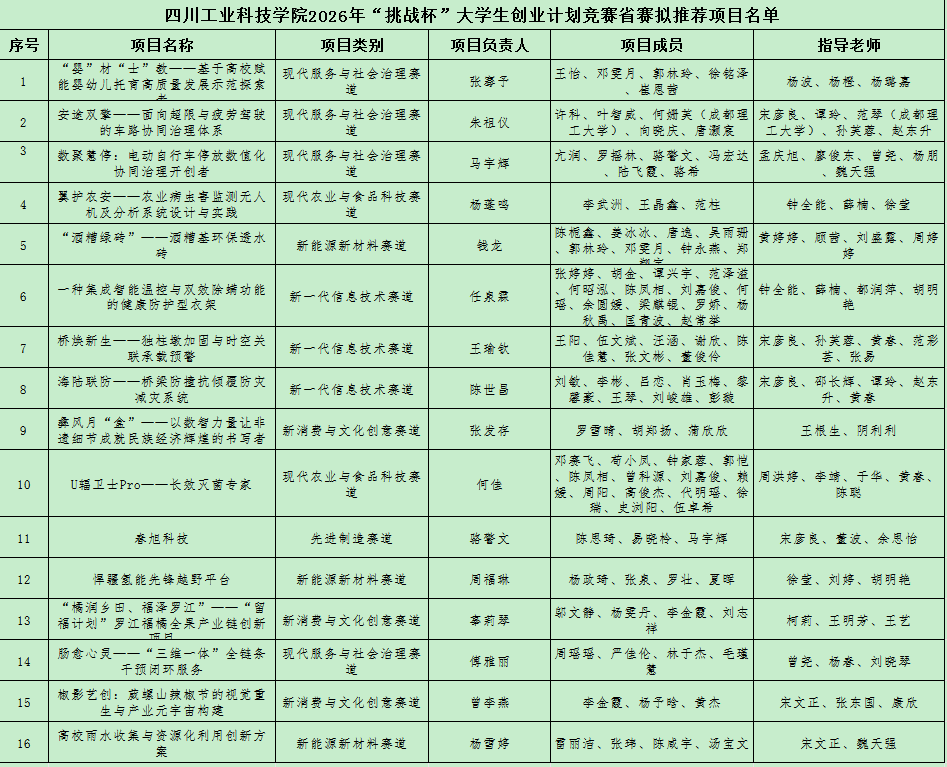 四川工业科技学院关于2026年“挑战杯”四川省大学生创业计划竞赛省赛拟项目的公示